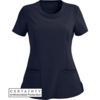 Blusón con cuello redondo presenta inserto tejido al frente del cuello al igual que canesus en los hombros y presilla para tarjeta de identificación en el hombro derecho. También tiene costuras de corte princesa al frente y en la espalda. Dos bolsillo de tipo parche con un bolsillo interior. El bolsillo derecho e izquierdo tienen ranura para lapícera (izquierdo con logotipo Infinity). Aberturas a los lados y panel tejido en el centro de la espalda ofrece un mejor ajuste. Pespuntes decorativas completa esta blusa.