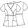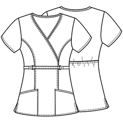 Modelo Junior cuello en V efecto cruzado, con bolsillos de tipo parche en ángulo al frente, costura princesa delantera, corte imperio en la cintura, espalda elástica y aberturas laterales